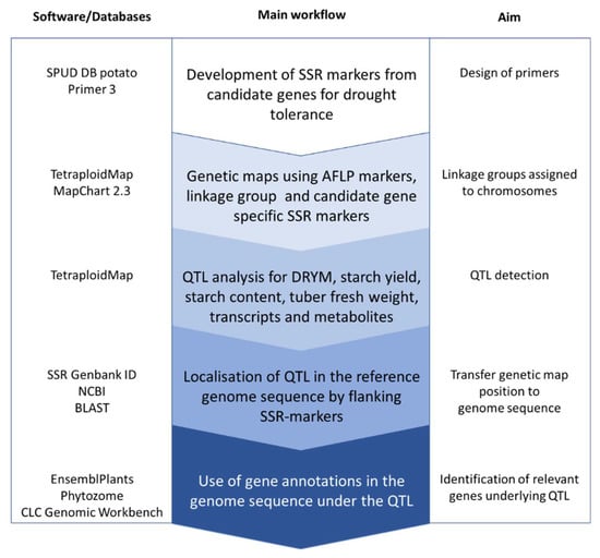 - Schumacher, C.; Krannich, C.T.; Maletzki, L.; Köhl, K.; Kopka, J.; Sprenger, H.; Hincha, D.K.; Seddig, S.; Peters, R.; Hamera, S.; et al. Unravelling differences in candidate genes for drought tolerance in potato (Solanum tuberosum L.) by use of new functional microsatellite markers. Genes 2021, 12, 494. [Google Scholar] [CrossRef]