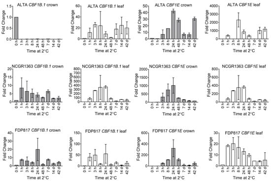The CBF/DREB1 transcription factors are key to cold responses in most cold-tolerant plants, controlling expression of a regulon that consists of more than 100 genes in Arabidopsis []. Two encoded CBFs, which showed the greatest similarity and clustered in phylogenetic analyses with the Arabidopsis, tomato and soybean cold-responsive CBFs, were examined (Figure S1). FvCBF1B.1 was most similar to these orthologs, occupying the same branch as the Arabidopsis, tomato and soybean CBFs. While FvCBF1E had its own branch, it still clustered with the CBF/DREB1s but not with the DREB2s, which are more involved with drought stress responses. Expression analyses showed a modest but rapid up-regulation of FvCBF1B.1 transcripts in response to cold acclimation (Figure 1). Interestingly, the transcript levels for FvCBF1B.1 in ‘ALTA’ crowns were strongly decreased after 1 h, persisting throughout the cold exposure. Across the genotypes, the changes in FvCBF1B.1 transcript levels in crowns were considered quite modest in comparison to other cold responsive plants that showed increases of hundreds- or thousands-fold within 3–6 h [,,,]. Interestingly, changes in FvCBF1B.1 transcript abundance tended to be greater in leaf tissues than in the crowns. Alternatively, FvCBF1E exhibited strong cold up-regulation, peaking in leaves at 3–8 h, typical of a CBF response pattern (Figure 1). In the crown, a similar pattern was observed but with several hours delay. FvCBF1E transcripts exhibited 100-1000-fold increases in leaf tissue in the two more cold-tolerant genotypes (‘ALTA’ and ‘NCGR1363’), which is usual for cold responsive CBFs in both the leaf and crown tissues.