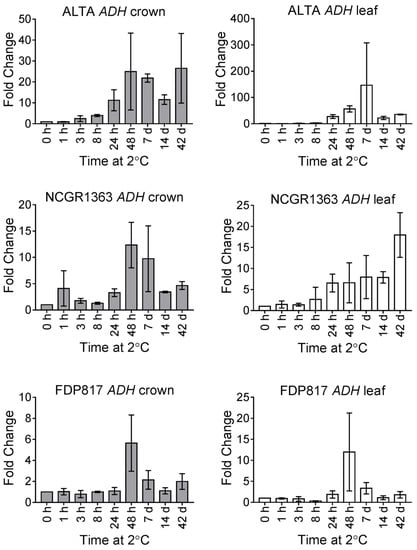In an earlier study it was suggested that ADH could serve as an important marker for cold tolerance in diploid strawberry []. ADH is known to have an important role in other abiotic stress conditions, including hypoxia, and the activity of ADH is vital for plant survival during anaerobic conditions. ADH mRNA accumulated to high levels by 48 h in both crown and leaf tissues from all diploid genotypes (Figure 2). The most cold-tolerant diploid strawberry (‘ALTA’) had the greatest fold increase in ADH transcripts levels. The strong and sustained increases in ADH transcript level described here are consistent with the cold-induced protein levels previously shown (ADH protein levels in F. vesca were highly correlated with LT50 (r = −0.86, []). These results are also consistent with responses in octoploid strawberry (Fragaria × ananassa) where previous work has shown that during cold-acclimation four ADH protein isoforms accumulated to higher levels in the freezing-tolerant cultivar ‘Jonsok’ compared to the less-tolerant ‘Frida’ and that the protein accumulation peaked after 42 d of LT []. As in octoploid strawberry, a key role for elevated levels of ADH contributing to enhanced freezing tolerance is consistent with the ability of ADH to enhance stress survival by alleviating hypoxic conditions caused by ice encasement [].