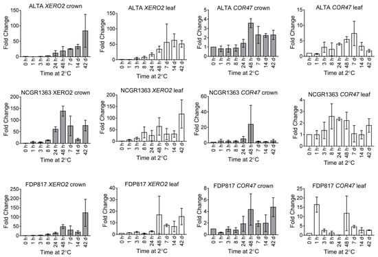 Dehydrin genes are well documented downstream targets of CBFs. We chose to analyze two homologs of dehydrins shown to be cold responsive in other plants (XERO2 and COR47). The FvXERO2 mRNA levels were found to increase with similar kinetics in ‘ALTA’ crown and leaf (Figure 3), although transcript increases were initiated slightly earlier in the leaves after the starting of cold treatment. No significant accumulation of the XERO2 transcripts were observed until 24 h of LT and the highest accumulation levels were generally found in both leaves and crowns at 42 d of LT. Generally, there was a steady and significant increase in transcript levels from 24 h to 42 d of LT, in crown and leaf tissue of all genotypes at 7 and 14 d of LT. A notable exception was a transient decrease observed in both the lesser cold-tolerant genotypes (‘NCGR1363’, ‘FDP817’). The FvCOR47 transcript was also up-regulated in all cold acclimated plants (Figure 3). In all genotypes, both crown and leaves showed a peak accumulation of FvCOR47 at 48 h of LT. This transcript showed a lower fold increase across all genotype/tissue-type/time-point-combinations compared to the FvXERO2 transcripts (approximately 10-fold lower). With the exception of NCGR1363 the changes in FvCOR47 transcript levels were greater in leaves than in the crown tissues. All genotypes showed similar temporal expression patterns in leaves: a gradual increase in transcript accumulation from 1 h to 48 h, followed by a decrease extending to 42 d of LT. In crowns, though all showed increases in FvCOR47 transcript levels, no consistent pattern in the transcript levels across genotypes was obvious.