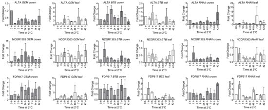Cold responses of F. vesca CBF transcripts. All transcript levels were normalized to FvPP2A and expressed relative to untreated control plants (0 h) in response to cold treatment. The crown and leaf tissues from three genotypes ‘ALTA’, ‘NCGR1363’ and ‘FDP817’ were cold treated for 1 h, 3 h, 8 h, 24 h, 48 h, 7 d, 14 d and 42 d, h = hours, d = days. PCR performed as described, with respective primer pairs (Table S4). S.D. are indicated as error bars.
