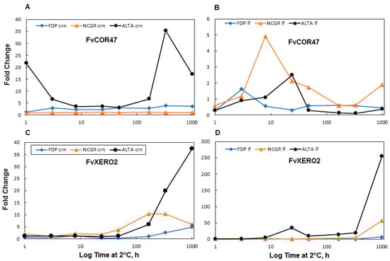 Cold responses of F. vesca dehydrin protein. (A,B) corresponding fold changes of FvCOR47 protein levels in crowns and leaves of three F. vesca genotypes in response to cold (2 °C) over time, respectively. (C,D) are graphs of fold changing of FvXERO2 protein levels in crowns and leaves of three F. vesca genotypes in response to cold (2 °C) over time, respectively. All samples were obtained as in Figure 1. Note that although the linear scale on the x-axis is shown in hours, these are the same samples and timepoints as shown in Figure 1, Figure 2, Figure 3 and Figure 4 (i.e., 1008 h time point is 42 d). Genotypes used are designated as FDP indicates the FDP817; NCGR indicates NCGR1363, and ALTA. Crown tissues are indicated as “crn”, leaf tissues as “lf”. Each lane in the gels were loaded with the same total protein (10 μg) and dehydrin levels were determined following Western blotting and were quantitated as described in Methods. Westerns were probed with either anti-COR47 or anti-XERO2 antibodies as indicated.