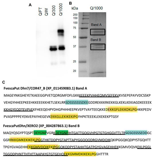 Identification of two dehydrins from F. vesca, ‘ALTA’ genotype. (A) SDS-PAGE immunoblot of partially purified dehydrins, probed with combination of anti-XERO2 and anti-COR47 antibodies. Q/FT, Q/W, Q/300 and Q/1000 represent flow-through, a 10 mM NaCl wash, a 300mM NaCl elution and a 1000 mM NaCl elution. (B) Coomassie-stained SDS-PAGE of the Q1000 fraction (see panel A) indicating with boxed regions, the sectors of the gel removed for mass spectroscopic analysis. (C) Amino acid sequence of COR47B with peptides (underlined) obtained by mass spectroscopy (two peptides, coverage = 13%, and the amino acid sequence of XERO2 with peptides (underlined) obtained by mass spectroscopy (five peptides, coverage = 56%).
