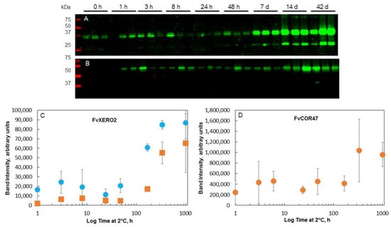 Dehydrin protein accumulation in cold-treated ‘ALTA’ crowns. Panel (A), Western blot of genotype ‘ALTA’ probed with anti-XERO2. Panel (B), Western blot of genotype ‘ALTA’ probed with anti-COR47. Panel (C), quantitation of band intensity in Panel (A) (anti-XERO 2). Circles represent the 35-36 kDa band, squares represent the 25 kDa band. Panel (D), Quantitation of band intensity in Panel (B) (anti-COR47). All signal quantitation are expressed as average (and standard deviation) values of three biological replicates (except for the 1 h time-point which was in duplicate) as shown on gels in panels (A,B). Replicates acclimated for 0 h, 1 h, 3 h, 8 h, 24 h and 48 h, 7 d, 14 d and 42 d at 2 °C were separated on 12% SDS-PAGE gel, transferred to a nitrocellulose membrane and probed with the respective antibody.