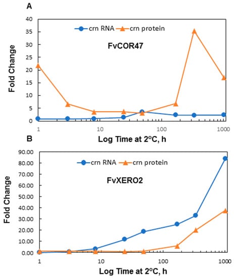 We aimed to identify genes potentially contributory to cold tolerance in F. vesca, by studying the association of transcript level of homologues of genes known to be involved in freezing tolerance, specifically targeting dehydrins, ABA-responsive genes, and CBFs, and further correlating their expression levels (in the case of dehydrins) with protein abundance. The work described here identifies several of the LT-induced dehydrin proteins in F. vesca and compares their expression changes to their encoding transcripts and further extends the evaluation of cold responses to other potential cold responsive genes, characterizing their time-dependent expression, and explores possible mechanisms contributing to cold tolerance.