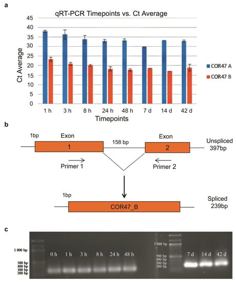 COR47B is the major COR47 transcript and is not alternatively spliced. (a) Comparison of transcript levels (Cts) from the distinct COR47A and COR47B isogenes during cold treatment. Specific primers were developed to distinguish transcripts from the two genes (Table S4). (b) Possible RNA products from COR47B gene. (c) A single spliced COR47B product was seen at all cold time points. Analysis of qRT-PCR products utilizing primers (Figure S1) to amplify the region surrounding the intron of the COR47B gene indicates the presence of a single major species consistent with a spliced intron (expected 239 b.p.) compared to an intron-retained product (expected 397 b.p.). All time points of the cold treatment show a similarly sized spliced product. These represent endpoints of qRT-PCR reactions and thus cannot be compared on a quantitative level. Left and right panels were results of samples run on different gels.