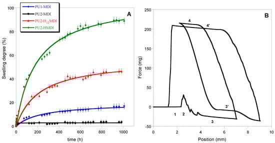 | PU2-H12MDI | 3 H12MDI: 2 DHMPA: 1 PTMO | I stage: T = 50 °C, t = 60 min II stage: T = 70 °C, t = 24 h | 2 |