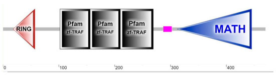 - Park, H.H. Structure of TRAF Family: Current Understanding of Receptor Recognition. Front. Immunol. 2018, 9, 1999. [Google Scholar] [CrossRef]