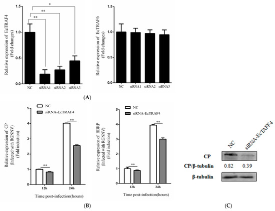 2.5. EcTRAF4 Knockdown Inhibits RGNNV Replication