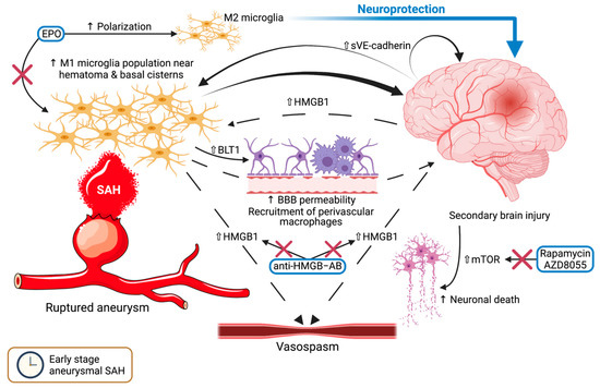 The mechanisms and pathways involving microglia in the early stage of subarachnoid hemorrhage. Following aneurysmal rupture, the blood in the subarachnoid and basal cisterns leads to an increased population of pro-inflammatory M1 microglia, which in turn will lead to secondary brain injury, heightened blood-brain barrier permeability, and recruitment of perivascular macrophages. Upregulated HMGB1 within the brain sustains this process and possibly leads to the occurrence of vasospasm, while anti-HMGB antibodies interrupt this cycle. VE-Cadherin maintains secondary brain injury and M1 microglia activation. Erythropoietin sways the polarization toward the M2 phenotype, resulting in a neuroprotective effect. Moreover, an upsurge of mTOR results in elevated neuronal death. Rapamycin and AZD8055 both inhibit the effects of mTOR. A transparent upward-pointing arrow denotes upregulation, whereas a thin upward-pointing arrow signifies an elevation of the mentioned process. Red crosses mark an inhibitory effect. Abbreviations (in alphabetical order): BBB, blood-brain barrier; BLT1, leukotriene B4 receptor 1; EPO, erythropoietin; HMGB1, high-mobility group box 1; HMGB1–AB, HMGB1-antibodies; mTOR, mammalian target of rapamycin; SAH, subarachnoid hemorrhage; sVE-Cadherin, soluble vascular endothelial cadherin.