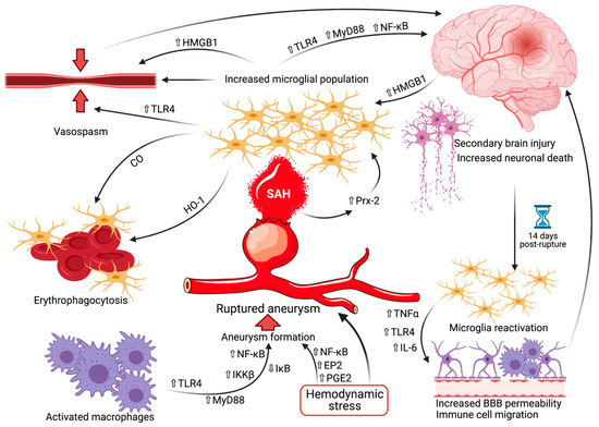 The pathophysiology of microglia in aneurysmal rupture. Activated macrophages in conjunction with hemodynamic stress lead to the formation of an intracranial aneurysm via pathways involving TLR4, MyD88, IKKβ, IκB NF-κB, PGE2, and EP2. Hemodynamic stress will also eventually result in aneurysmal rupture. Aneurysmal SAH begets an increased reactive microglial population by way of Prx-2 upregulation. The microglia then generate secondary brain injury and subsequent increased neuronal death, partially also via vasospasm. At 14 days after hemorrhage, a reactivation of the microglia occurs, inducing increased BBB permeability and immune cell migration, further propagating the secondary brain injury. On the other hand, anti-inflammatory microglia are also responsible for the erythrophagocytosis at the site of SAH, diminishing its detrimental effect on the cerebral parenchyma. A transparent upward-pointing arrow denotes upregulation, whereas a transparent downward pointing arrow signifies downregulation. Abbreviations (in alphabetical order): BBB, blood-brain barrier; CO, carbon monoxide; EP2, prostaglandin E receptor 2; HMGB1, high-mobility group box 1; HO-1, heme oxygenase isoform 1; IκB, inhibitor kappa B; IKKβ, inhibitor kappa B kinase β; IL-6, interleukin 6; MyD88, myeloid differentiation primary response gene 88; NF-κB, nuclear factor kappa-light-chain-enhancer of activated B cells; PGE2, prostaglandin E 2; Prx-2, peroxiredoxin 2; SAH, subarachnoid hemorrhage; TLR4, toll-like receptor 4; TNFα, tumor necrosis factor alpha.