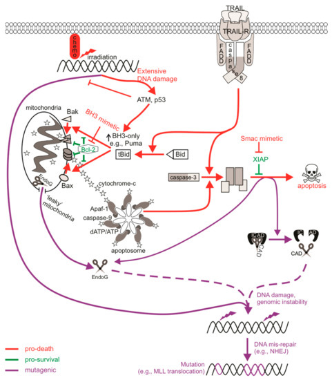 In line with the concept of partial cytochrome c release from the mitochondria in otherwise viable cells, Ichim et al. [168] reported CAD-mediated genotoxicity in BH3 mimetic-treated cells with “leaky” mitochondria, resulting in sublethal MOMP (“minority” MOMP) and low-level caspase activity. Unlike CAD-mediated mutagenesis following death receptor ligation or during periods of prolonged mitotic arrest, whereby inhibition of DNA-PK (or ATM) activity severely reduced H2AX phosphorylation [160,162,165], DNA damage following antagonism of Bcl-2/Bcl-xL by ABT-737 appeared to be dependent on expression of JNK1/2 [168]. JNK-dependent sublethal MOMP and subsequent caspase-mediated nuclease genotoxicity was also reported in naïve cancer cells [159]. This may suggest a difference in key DDR protein activation of certain DNA repair pathways depending on either cell type or strength of the stimulus. For instance, Ichim et al. [168] described transforming capabilities for ABT-737 under oncogenic cellular conditions, while Shekhar et al. [169] failed to detect mutations in clonogenically viable cells after sublethal treatment with the same drug, at least at concentrations that elicited Bax/Bak-dependent death. Exposure to ABT-263/Navitoclax (an orally available derivative of ABT-737) also failed to provoke DNA damage or mutations at clinically relevant concentrations, even when increases in caspase activity and apoptosis were detected [170,171]. It is possible for some but not all cell types to tolerate minority MOMP, given that loss of mitochondrial function often impacts a cell’s clonogenic competency. This may be due to varied expression of pro-survival proteins such as IAPs or Bcl-2 family members between the different cell types used in these studies, which may influence whether or not cells tolerate and recover from mitochondrial damage [172]. Minority MOMP and associated caspase/CAD-dependent mutagenesis was also implicated upon expression of the BH3-only protein BIK [173]. BIK-expressed or staurosporine-treated cells with low and high levels of caspase activity were sorted and clonogenic potential determined. Colonies failed to form following staurosporine exposure regardless of caspase levels, whereas at least 50% of cells maintained clonogenicity after BIK expression and caspase activation, implying partial MOMP within viable cells [173].