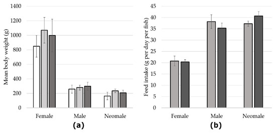 Mean body weight was measured for fasted, NC and HC females, males and neomales (Figure 1a). Differences were not statistically significant between fasted females and NC and HC females as well as between NC females and HC females. Similar results were also found for males and neomales. Concerning the feed intake, females displayed no differences between females fed with the NC diet and females fed with the HC diet with around 20 g of feed per fish. No significant differences were found in males or in neomales eating 35–38 and 38 g per fish and day, respectively.