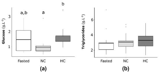 Plasma glucose (Figure 6a) and plasma triglycerides (Figure 6b) concentrations were analysed and compared in fasted neomales and neomales fed with either the NC diet or the HC diet. Concerning the glucose plasma concentration, fasted neomales displayed lower glycaemia compared to neomales fed with the HC diet, and differences were not statistically significant between neomales fed with the NC diet and neomales fed with the HC diet. Concerning the level of plasma triglycerides, no significant differences were demonstrated between fasted and fed neomales, as well as between neomales fed with the NC diet and neomales fed with the HC diet.
