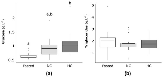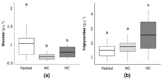 Plasma glucose and triglycerides concentrations were investigated for fasted females and females fed either the NC or the HC diet (Figure 2). The glucose plasma concentrations (Figure 2a) were not significantly different between females fasting 15 days and females fed with the NC or HC diet. Concerning the fed females, females with the NC diet had a significantly lower glycaemia compare to females fed the HC diet (p = 0.02). For triglycerides plasma concentrations (Figure 2b), no differences were statistically significant between fasted females and fed females as well as between NC and HC females.