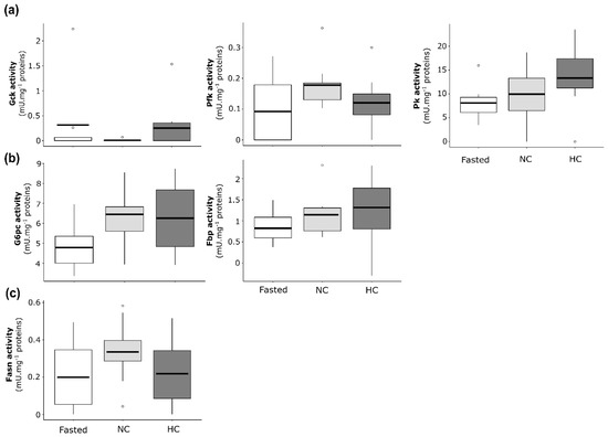 Enzymatic activities were analysed and compared between females fasted for 15 days, females fed with the NC diet and females fed with the HC diet for 2 days. Concerning glycolysis enzymatic activities (Figure 3a), glucokinase (Gck) exhibited no significant differences between fasted females and females fed with the NC or HC diet. Phosphofructokinase (Pfk) exhibited a lower activity in liver of fasted females compared to females fed with the HC diet, and the difference was not statistically significant between NC and HC females. Concerning the pyruvate kinase (Pk), fasted females exhibited a lower enzymatic activity compared to females fed with the NC or the HC diet, but no statistically significant difference was highlighted between females fed the NC and the HC diet. Concerning the gluconeogenesis (Figure 3b), the glucose-6-phosphatase (G6pc) and the fructose-1,6-bisphosphatase (Fbp) displayed no significant statistical differences between fasted females and females fed with the NC or the HC diet, as well as between females fed with NC diet and females fed with the HC diet. Finally, concerning the de novo lipogenesis-related enzyme (Figure 3c), differences were not statistically significant between fasted females and females fed with the NC or the HC diet, as well as between NC-fed females and HC-fed females for the fatty acid synthase (Fasn).