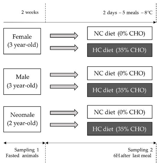 While glucose metabolism is well-described for juvenile rainbow trout [4,8], only few studies have focused on this metabolic pathway in broodstock [9,10,11,12,13] and described it during gametogenesis in males and females. However, only one study addressed questions around the effect of feeding broodstock with a diet enriched in carbohydrates, and specifically on reproductive performance by demonstrating higher fecundity and survival rate of progeny of females fed with a diet containing white flour compared to females fed with a controlled diet [10]. More recently, Callet et al. reported that female and male broodstock are able to eat and use a high-carbohydrate diet (35%) during the whole reproductive cycle for females (9 months) and during the early part of the cycle for males (4 months), as reflected by the growth performance and the success of the reproduction process. Both sexes were never hyperglycaemic when fed with a high-carbohydrate diet, to the contrary of what is commonly observed in juveniles and resulting from a particular regulation of both the glucose and the lipid metabolism [14]. However, it is not clear whether the modulation of the glucose metabolism, which may explain their ability to eat and grow under a high-carbohydrate diet compared to juveniles, is related to their physiological stage (broodstock) or results from a long-term consequence/adaption of the intake of digestible carbohydrates (4 and 9 months respectively, for males and females). Moreover, Callet et al. evaluated the long-term consequences of a high-carbohydrate diet only in female and male broodstock. However, a third sex, called neomale, is commonly used in aquaculture to produce all-female mono-sex populations [15]. To our knowledge, no study has investigated the glucose and lipid metabolism of these particular individuals fed a high-carbohydrate diet.