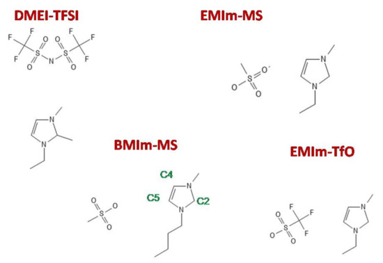 The ionic liquids used for the present study, 1-ethyl-2,3-dimethylimidazolium bis(trifluoromethanesulfonyl)imide (labeled as sample DMEI-TFSI), 1-ethyl-3-methylimidazolium trifluoromethanesulfonate (labeled as sample EMI-TfO), 1-ethyl-3-methylimidazolium methanesulphonate (labeled as sample EMI-MS), and 1-butyl-3-ethylimidazolium methanesulphonate (labeled as sample BMIM-MS), were purchased from Iolitec, Heilbronn, Germany (samples DMEI-TFSI and EMI-TfO, having a purity higher than 90%) and from Sigma Aldrich, St. Louis, MO, USA (samples EMI-MS and BMIM-MS, with a purity ≥95%). A schematic picture of the samples is reported in Figure 1.