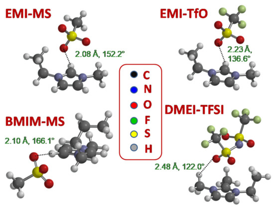 The distances between the closest H atom of the cation and O atom of the anion atoms are typical of weak to moderate hydrogen bonding [42]; in particular, the values obtained for EMI-MS, EMI-TfO, and BMIM-MS range between 2.08 and 2.23 Å: EMI-MS shows the shortest distance of 2.08 Å, suggesting the strongest bond. Moreover, the angles formed by the CHO atoms range between 136 and 166° for EMI-MS, EMI-TfO, and BMIM-MS, while it is 122° for DMEI-TFSI; this implies that for the latter ionic couple, the H-O bond with the anion is less aligned with the CH bond of the cation.