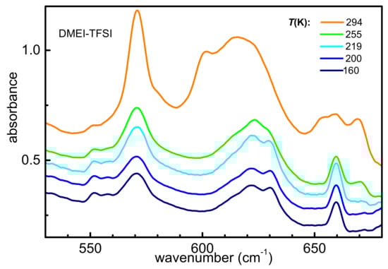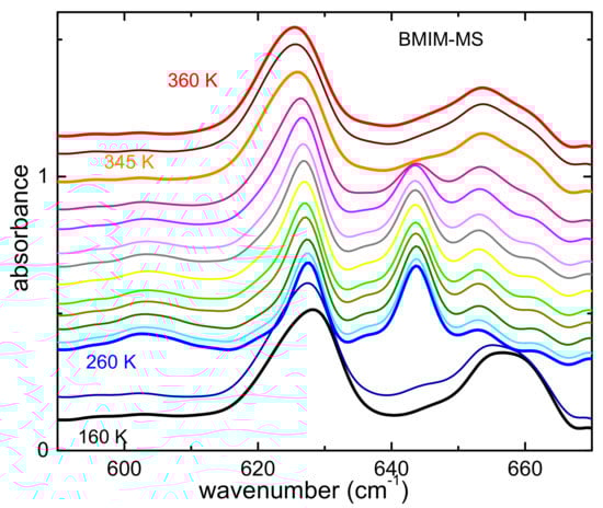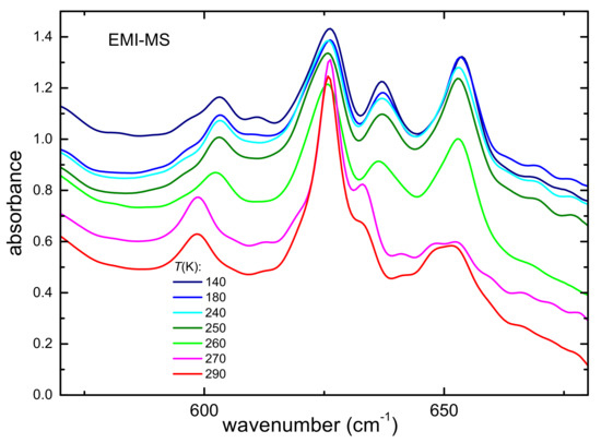 The absorbance spectrum of sample EMI-MS measured on heating up to 300 K in the frequency range between 550 and 700 cm−1, where the intramolecular vibrations of single ions are observed, is displayed in Figure 3.