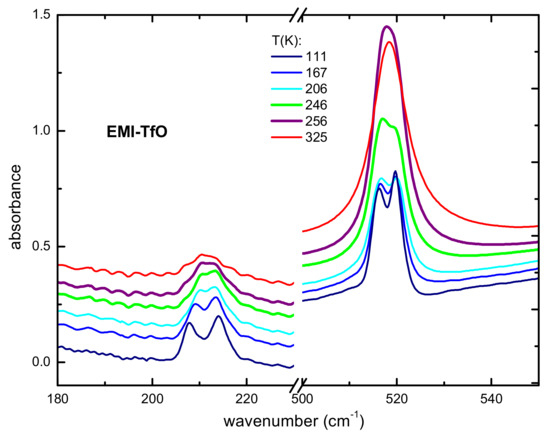 The absorbance spectrum of sample EMI-TfO measured between 180 and 550 cm−1 on heating between 110 and 290 K is reported in Figure 4.
