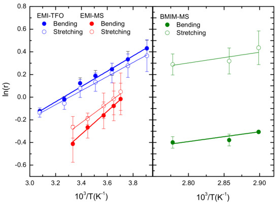 The values of the average energy obtained by the best fit are reported in the Table 2. It is worth noting that, for all samples, the resulting van’t Hoff slope indicates that the H-bonded ion pairs are favored in energy over the dispersion-interaction-dominated pairs by about 5 kJ/mol for the TfO-based sample and ~8 kJ/mol for the sample with the MS anion.