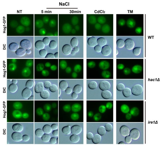 Since the nuclear localisation of Hog1 is regulated by its phosphorylation level [39,40], and since Ire1 and Hac1 regulate the phosphorylated activation of Hog1 from the above results, we tried to evaluate whether subcellular localisation of Hog1 is regulated by Ire1 and Hac1 in response to TM or Cd. To achieve this, we tagged Hog1 with GFP at its C-terminus in the WT BY4741, ire1Δ and hac1Δ mutant strains. As expected, Hog1-GPF fusion protein displayed a significant nuclear relocation in the presence of 0.4 M NaCl in WT cells within 5 min (Figure 2), which was consistent with the previous study [41]. Upon ER stress, Hog1-GFP also displayed a nuclear location, as previously reported after 1 h of TM treatment [30]. However, upon Cd exposure, Hog1-GFP displayed similar cytoplasmic localisation to that observed in untreated cells after 1 h of Cd treatment, which was in contrast to the situation under osmotic stress conditions (Figure 2). Surprisingly, the levels of Hog1-GFP fusion protein accumulated in the nuclei of hac1Δ and ire1Δ mutants were much higher than in the WT cells, although there were no significant differences with or without TM or Cd treatment (Figure 2). It is worth noting that Hog1-GFP was transported to the cytosol after a 30 min treatment with 0.4 M NaCl in WT cells, while it could still accumulate in the nuclei of ire1Δ and hac1Δ mutants. The nuclear accumulation of Hog1 is based on its phosphorylation level, and Hog1 is phosphorylated upon ER stress and this is dependent on the UPR pathway [30]. However, disruption of the UPR pathway could still promote nuclear accumulation. These results indicate that much more phosphorylated Hog1 must enter the nucleus, where it functions in an unknown way, when the Ire1-mediated UPR pathway is inhibited.