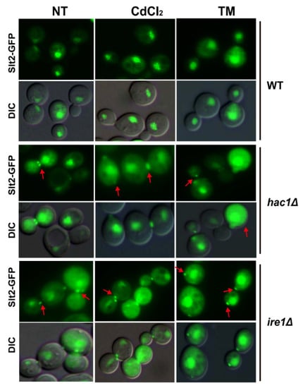 Since the phosphorylation of Slt2 can be activated by ER stress, and since Slt2 is required for cell growth and the activation of UPR in response to ER stress, we wondered whether the localisation of Slt2 is also regulated by ER stress. Therefore, we measured the localisation of Slt2 using GFP-tagged Slt2-GFP fusion protein in WT BY4741, ire1Δ and hac1Δ strains after treatment with Cd and TM. As shown in Figure 5, the nuclear localisation of Slt2 was not affected in wide type BY4741 cells in response to TM or Cd. Surprisingly, we found that in the hac1Δ and ire1Δ mutants, Slt2-GFP could be visualised in the nucleus, the cytosol, and especially the bud neck, and the distribution was similar in non-treated and stressed cells. Upon ER stress, the MAP kinase Slt2 plays crucial roles in regulating the localisation and morphology of the septin ring via a mechanism independent of the UPR pathway mediated by the ER transmembrane receptor riboendonuclease Ire1 [35]. Since Slt2 can regulate septin structures, cER inheritance, and cytokinesis upon ER stress, which is independent of the Ire1-mediated UPR [35], the deletion of Ire1 or Hac1 might result in a greater need for Slt2 function to regulate these processes, which has not been observed in WT cells. From this point of view, we reasoned that when Ire1 or Hac1 is absent, the MAP kinase Slt2 must be transported to the bud neck to perform some of these other unknown functions.