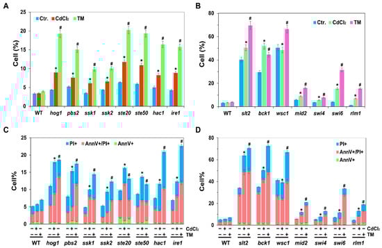 Yeast cells were first cultured overnight in YPD medium, then inoculated into fresh SC medium to an initial OD600 of ~0.1. When cells had grown to middle log phase, they were split into three aliquots, and cultured in the absence or presence of 50 µM CdCl2 or 1 µg/mL TM for an additional 4 h. Next, ~5 × 106 cells were harvested by centrifugation and used to analyse the intracellular ROS levels and cell death. To measure the intracellular ROS levels, cells were first resuspended in 250 μL of phosphate-buffered saline (PBS) with 2.5 μg/mL dihydroethidium (DHE, sigma, Beijing, China) and incubated in the dark for 30 min. Annexin V (Solarbio, Beijing, China) staining analysis was used to test the cell death rates in response to Cd and performed as previously described [58]. All samples were visualised by fluorescence microscopy using a Nikon Eclipse 80i epifluorescence microscope and positive cells were counted by Image J software. At least 500 cells were counted in each sample, and the data are presented as the mean ± standard deviation (SD) from three independent samples.