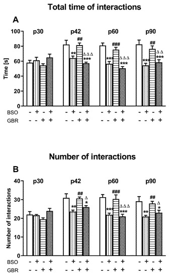 A two-way ANOVA performed for the total time spent in social interactions revealed an overall treatment effect of BSO (for p42—F(1,28) = 36.327, p < 0.001; for p60—F(1,28) = 70.315, p < 0.001; for p92—F(1,28) = 30.258, p < 0.001) but a lack of GBR 12909 treatment effect and no interaction between these two model substances in any of the studied time points (Figure 1A). Similarly, a two-way ANOVA carried out for the number of social interactions showed only a significant treatment effect of BSO (for p42—F(1,28) = 20.747, p < 0.001; for p60—F(1,28) = 38.099, p < 0.001; for p92—F(1,28) = 17.648, p < 0.001) on this parameter at three out of four studied time points (Figure 1B).
