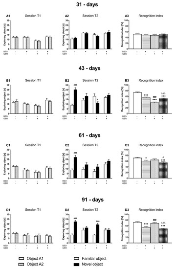 Two-way ANOVA performed in groups of adolescent 31-day-old rats demonstrated neither the effects of the tested model compounds nor their combination on the values of the recognition indexes (Figure 2A3). However, this analysis performed for the recognition index in adolescent 42-day-old rats (Figure 2B3) revealed a significant treatment effect of GBR 12909 (F(1,36) = 109.69, p < 0.001) and an interaction of BSO × GBR 12909 (F(1,36) = 79.341, p < 0.001), but a lack of treatment effect of BSO alone (F(1,36) = 0.989, NS). However, in adolescent 61-day-old rats a two-way ANOVA showed both significant treatment effect of BSO (F(1,36) = 14.797, p < 0.001) and GBR 12909 (F(1,36) = 5.232, p < 0.05) but no interaction between these model compounds (F(1,36) = 0.041, NS) (Figure 2C3). Furthermore, in adult 91-day-old rats only treatment effect of BSO (F(1,36) = 71.530, p < 0.001) was observed (Figure 2D3). Post hoc comparison showed that values of the recognition indexes in group of rats treated with BSO alone or in combination with GBR 12909 were significantly decreased compared to the value of this parameter in the control group in adolescent (p43, p61) and in adult rats (p91).