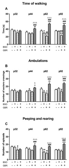 Regarding the third parameter measured in the OFT, i.e., the number of peeping and rearing episodes, a two-way ANOVA revealed a significant treatment effect of BSO ((for p44 (F(1,36) = 5.586, p < 0.05); for p62 (F(1,36) = 4.464, p < 0.05); for p92 (F(1,36) = 24.027, p < 0.0001)) as well as an interaction of BSO × GBR 12909 ((for p44 (F(1,36) = 14.004, p < 0.001); for p62 (F(1,36) = 36.760, p < 0.001); for p92 (F(1,36) = 27.376, p < 0.0001)). This analysis also showed a significant treatment effect of GBR 12909 for early adolescence (for p32 (F(1,36) = 4.429, p < 0.05) and for adulthood (for p92 (F(1,36) = 11.287, p < 0.002). Post hoc analysis demonstrated that at conditions of the combined administration of BSO + GBR 12909 at postnatal days p5–p16, the number of peeping and rearing episodes in adolescence (p44, p62) and adulthood (p92) was significantly higher than in groups that were treated with the vehicle (control), BSO or GBR 12909 alone during early postnatal life (Figure 3C).