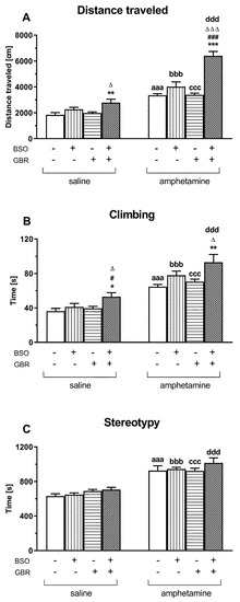 The effect of chronic administration of BSO and GBR 12909, alone or in combination, during postnatal days p5–p16, on the spontaneous and AMF-induced locomotor activity and stereotypy, measured in 90-day-old Sprague–Dawley rats using actometers. (A) Horizontal locomotor activity is presented as the total distance traveled expressed in cm, (B) vertical locomotor activity is shown as the total time spent climbing expressed in seconds (s), and (C) stereotypy as the total time devoted to stereotypical behavior expressed in seconds. These parameters were recorded during a 30–minute measurement session. Data are presented as the mean ± SEM, n = 10 for each group. Statistical analysis was performed using a two-way ANOVA; symbols indicate significance of differences according to the Newman–Keuls post hoc test, *** p < 0.001, ** p < 0.01, * p < 0.05 vs. control; ### p < 0.001, # p < 0.05 vs. BSO-; and ∆∆∆ p < 0.001, ∆ p < 0.05 vs. GBR 12909-treated groups. Comparisons between the corresponding groups treated with saline or AMF were performed using the Student’s t-test for independent samples, aaa p < 0.001 vs. saline-treated control, bbb p < 0.001 vs. saline-treated BSO group; ccc p < 0.001 vs. saline-treated GBR 12909 group; ddd p < 0.001 vs. saline-treated BSO + GBR 12909 group.