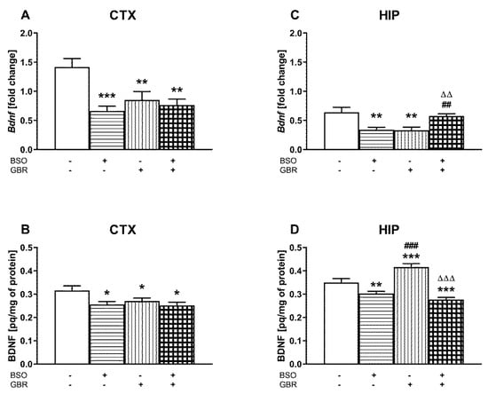 The effect of chronic administration of BSO and GBR 12909, alone or in combination, during postnatal days p5–p16, on BDNF mRNA and protein levels in the PFC (A,C) and HIP (B,D) of adult rats. Data are presented as the mean ± SEM, n = 7–8 for each group. Statistical analysis was performed using a two-way ANOVA; symbols indicate significance of differences according to the Newman–Keuls post hoc test, *** p < 0.001, ** p < 0.01, * p < 0.05 vs. control; ### p < 0.001, ## p < 0.01, vs. BSO-; and ∆∆∆ p < 0.001, ∆∆ p < 0.01 vs. GBR 12909-treated groups.