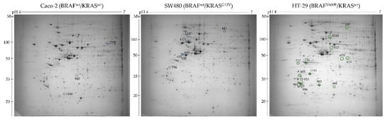 Representative 2-DE gel images of total cell proteome obtained in the pH range 4–7 from the three colon cancer cell lines differing in BRAF mutational status. Marked with a green circle are up-regulated protein spots detected in BRAFV600E mutant cells, while blue circles designate down-regulated protein spots.