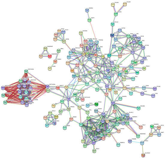 The Search Tool for Retrieval of Interacting Genes (STRING) (http://string-db.org/, accessed on 27 May 2020) online tool was applied to construct the PPI network, where the confidence score was set to 0.900 (highest confidence). The PPI network was visualized by Cytoscape (https://cytoscape.org/, accessed on 27 May 2020), an open source software platform for visualizing complex networks. Each node corresponds to a protein, whereas the edges represent the interactions between proteins that contribute to the same biochemical function or pathway.