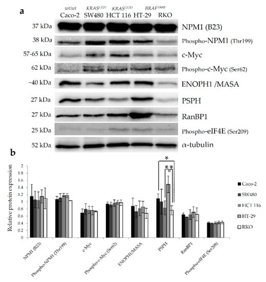 Baseline expression levels of selected protein targets were investigated by western blot in two BRAFV600E mutant colon cancer cell lines harboring WT KRAS (HT-29 and RKO), two WT BRAF cell lines carrying KRAS mutations (HCT 116 and SW480) and a double WT colon cancer cell line (Caco-2). Amongst all studied proteins, only the expression levels of NPM1 and phospho-c-Myc (Ser62) showed a trend towards an increase in both BRAF-mutated cell lines (Figure 3), albeit statistically non-significant when compared to other cell lines. Interestingly, a statistically significant difference was observed with up-regulated levels of PSPH in HT-29 cells in comparison with other cell lines carrying wild-type BRAF (Figure 3). However, this pattern of PSPH expression was not replicated in the RKO cell line, which could be, at least partially, explained by the difference in the mutational status of the p53 gene between these two cell lines, which is critically involved in the regulation of amino acid metabolism in cancer cells [17].