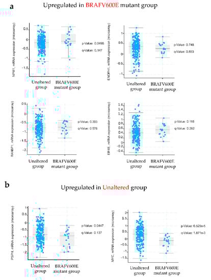 Validation of selected protein candidates in the Cancer Genome Atlas (TCGA) database. Shown here are mRNA expression levels corresponding to selected proteins using the colorectal adenocarcinoma dataset from the TCGA database in cBioPortal that included 20 cases with the BRAFV600E mutation and 200 cases without an indicated mutation (unaltered group). A p-value < 0.05 was considered statistically significant.