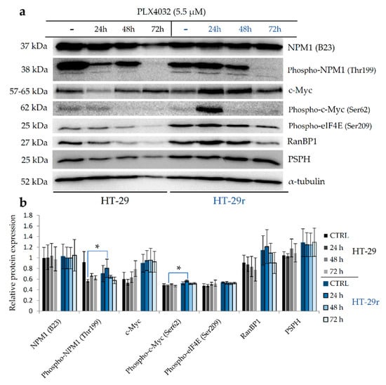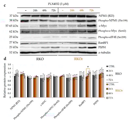 The expression and activity of c-Myc, a common transcriptional regulator of NPM1 and RanBP1 and an interaction partner of NPM1, were also differentially regulated between sensitive and resistant cell lines after the PLX4032 challenge. The levels of c-Myc were generally higher in resistant HT-29r cells before and after the exposure to PLX4032 when compared with sensitive HT-29 cells (Figure 5a,b). Importantly, a statistically significant increase in the p-c-Myc level was observed in HT-29r cells after 24 h of treatment when compared to sensitive cells. Similarly, a trend towards a sustained increase in the levels of c-Myc and p-c-Myc peaking at 72 h after the exposure to PLX4032 was observed in resistant RKOr cells when compared to their sensitive counterpart (Figure 5c,d).