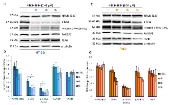 Western blot analysis of relative protein expression of nucleophosmin, c-Myc and its transcriptional targets RanBP1 and phosphoserine phosphatase (PSPH) in vemurafenib-resistant HT-29r (a,b) and RKOr (c,d) colon cancer cells with BRAFV600E mutation after the treatment with cytotoxic concentrations of nucleophosmin inhibitor NSC348884 for indicated time periods. Densitometry analysis of western blot bands was carried out by Quantity One software to calculate relative protein abundance (b,d). Data represent mean and standard deviation obtained from two independent biological experiments with two technical replicates. α-Tubulin was used as loading control. Statistical significance where p < 0.05 is denoted with an asterisk.