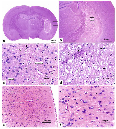 Photomicrographs of H&E-stained sections of the rat brain after 24 h in tMCAO model conditions. (a) Coronal rat brain section at the level of −2.5 mm from the bregma. The oval shape indicates the damaged area involving the caudoputamen nucleus of the right hemisphere. The rectangle indicates the secondary somatosensory cortex. (b) The zone of ischemic injury of the caudoputamen indicated within panel (a) is shown at a higher magnification. (c) Area of panel (b) marked with a white rectangle. The change zone: from normal to ischemic-injured (penumbra) tissue; intact neurons (thick white arrows); decrease of nuclear basophilia in the neurons (thin white arrows); ischemic damage to neurons, with pyknotic nuclei and pericellular edema (thick black arrows); red neurons (thin black arrows); and vesiculation of the neuropile (white asterisks). (d) Area of panel (b) marked with a black rectangle. The ischemic core: vacuolation with edema of the neuropile (white asterisks); swollen neurons (white triangles); necrotic cells (thick black arrows); and absence of intact neurons. (e) The area of panel (a) marked with a rectangle. Normal cytoarchitecture of the secondary somatosensory cortex. (f) The area of panel (e) marked with a white rectangle. The inner pyramidal (V; ganglionic) layer. The perikarya of large pyramidal cells are filled with basophilic substances.