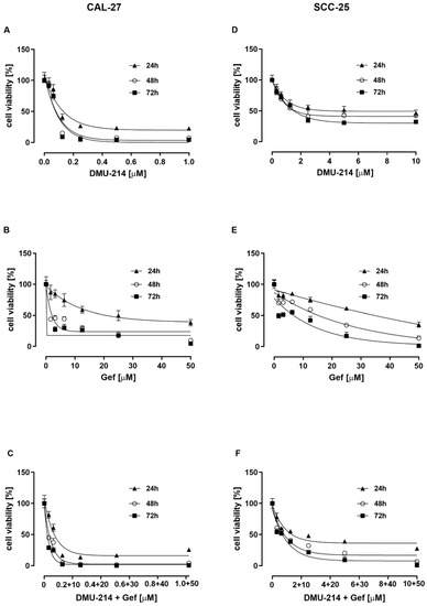 The cytotoxic activity of DMU-214, Gef, and the combination of DMU-214 and Gef in CAL-27 and SCC-25 cell lines. The viability of CAL-27 cells was determined after 24, 48, and 72 h incubation with DMU-214 (0–1 μM) (A), Gef (0–50 μM) (B), and the mixture of DMU-214 (0–1 μM) and Gef (0–50 μM) (C). The viability of the SCC-25 cell line was assessed following 24, 48, and 72 h incubation with DMU-214 (0–10 μM) (D), Gef (0–50 μM) (E), and the mixture of DMU-214 (0–10 μM) and Gef (0–50 μM) (F). Results of three independent replicates are presented as mean ± SD.
