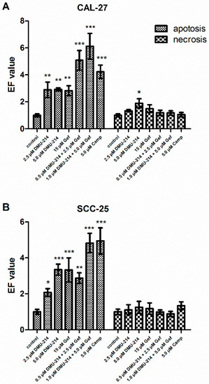 The induction of apoptosis and necrosis was assayed by the Cell Death Detection ELISAPLUS test. The pro-apoptotic and -necrotic activities of the compounds tested were expressed as the enrichment factors (EFs). Camptothecin was used as a positive control for apoptosis induction and caused an increase in the nucleosome level in CAL-27 and SCC-25 lysates, EF = 4.22 ± 0.49 and EF = 4.94 ± 0.72, respectively (Figure 2A,B). The highest pro-apoptotic effect was reported after exposure of CAL-27 cell line to the mixture of compounds tested in the concentrations of 1.0 µM DMU-214 and 5.0 µM Gef as well as 0.5 µM DMU-214 and 2.5 µM Gef, EF = 6.11 ± 0.96 and EF = 5.07 ± 0.73, respectively (Figure 2A). The increased EF values were also shown after 2.5 μM and 5.0 μM DMU-214 treatments. However, as compared to both combinations of DMU-214 and Gef, the pro-apoptotic activity of DMU-214 was less pronounced not only in the concentration of 2.5 μM (EF = 2.89 ± 0.57), but also 5 μM (EF = 2.91 ± 0.11). Correspondingly, the exposure to Gef in the concentration of 15 μM also caused an increase in the level of the nucleosomes in CAL-27 lysates (EF = 2.82 ± 0.37), but to a lesser extent than the mixture of DMU-214 and Gef.