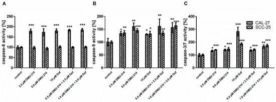 Effect of DMU-214, Gef, and the combination of DMU-214 and Gef on caspases activity in CAL-27 and SCC-25 cell lines compared to the vehicle-treated control. The casp-8 (A), -9 (B) and -3/7 (C) activities were determined by Caspase-Glo®-8, -9, -3/7 assay. Results of three independent replicates are presented as mean ± SD. *** p < 0.001, ** p < 0.01, * p < 0.05 indicate a significant difference from the control.
