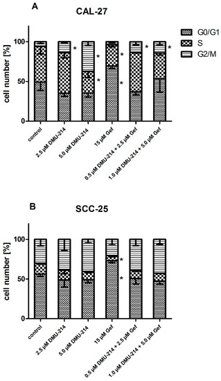 Flow cytometry analysis demonstrated that CAL-27 cells were arrested in the G2/M phase with both concentrations of DMU-214 applied alone and in combinations with Gef (Figure 4A). Treatment with DMU-214 (5 μM) also resulted in a decreased CAL-27 cell number in S phase as compared to the untreated controls. The exposure of CAL-27 and SCC-25 cell lines to Gef (15 μM) caused a cell cycle arrest at G0/G1 phase, while the number of cells in the S phase was decreased (Figure 4A,B).