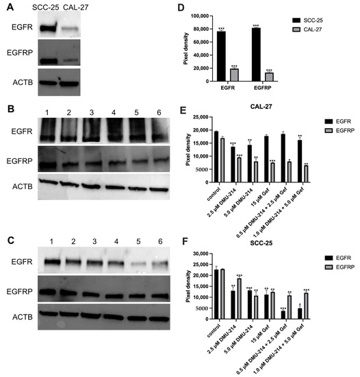 Western blot analysis of EGFR and EGFRP native expression pattern (A) as well as the effect of DMU-214, Gef, and the combination of DMU-214 and Gef on the EGFR and EGFRP expression profile in CAL-27 (B) and SCC-25 (C) cell lines. Cells were treated with: lane 1—control, lane 2—2.5 μM DMU-214, lane 3—5 μM DMU-214, lane 4—15 μM Gef, lane 5—0.5 μM DMU-214 + 2.5 μM Gef, lane 6—1.0 μM DMU-214 + 5.0 μM Gef. ACTB (β-Actin) was used as a loading control. Densitometric studies were used to analyze the level of EGFR and EGFRP in native expression pattern (D), as well as in CAL-27 (E) and SCC-25 (F) cells treated with a vehicle or DMU-214, Gef, and the combination of DMU-214 and Gef. Results of three independent replicates are presented as mean ± SD. *** p < 0.001, ** p < 0.01, * p < 0.05 indicate a significant difference from the control.