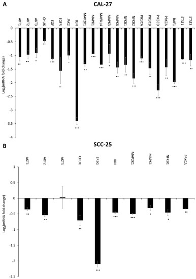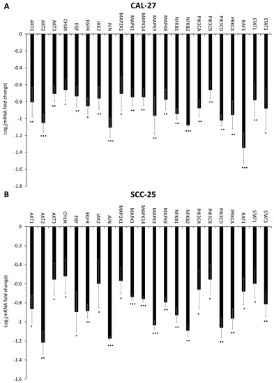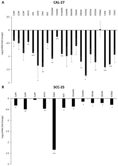 The RT-qPCR was conducted to analyze the expression profile of EGFR signaling pathway-related genes in CAL-27 and SCC-25 cell lines (Figure 6, Figure 7 and Figure 8). Significant changes in the expression pattern of 22 genes were found in CAL-27 and SCC-25 cell lines treated with 5 μM DMU-214 (Figure 6A,B). A down-regulation in the level of the following transcripts: AKT1, AKT2, AKT3, CHUK, EGF, EGFR, JAK2, JUN, MAP2K1, MAPK1, MAPK14, MAPK3, MAPK8, NFĸB1, NFĸB2, PIK3CA, PIK3CB, PIK3CD, PRKCA, RAF1, STAT1, and STAT3 was shown as compared to control.