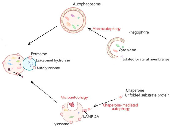 The general process of macroautophagy, microautophagy, and chaperone-mediated autophagy. In the process of macroautophagy, the contents are encapsulated by a bilayer membrane structure to form autophagosomes. Autophagosomes then fuse with lysosomes to form autolysosomes, in which the separated contents are usually degraded for recycling. Microautophagy refers to the direct invagination of lysosomal membrane, which then encapsulates cell contents. In the process of chaperone mediated autophagy, the cytoplasmic proteins are transported to lysosomal chambers after binding with chaperones, and then digested by lysosomal enzymes.