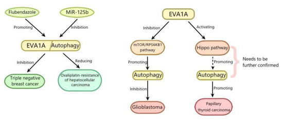 EVA1A is a new protein discovered in recent years, which can regulate autophagy and apoptosis. This review summarized the current research on the role of eva-1 in regulating autophagy in a variety of pathophysiological processes: (1) MiR-125b reduces oxaliplatin resistance by decreasing EVA1A-mediated autophagy; (2) EVA1A suppresses glioblastoma cells proliferation by promoting autophagy through inhibiting mTOR/RPS6KB1 pathway; (3) EVA1A promotes the progression and EMT of PTC through activating autophagy via hippo pathway, which needs to be further conformed; (4) Flubendazole induced autophagy-mediated death of TNBC cells by promoting EVA1A-regulated autophagy, thus inhibiting tumor proliferation and migration; (5) EVA1A-mediated autophagy improves ALF by maintaining mitochondrial homeostasis; (6) EVA1A improves hepatic I/R injury through inhibiting NLRP3 activation by inducing autophagy via inhibiting mTOR pathway in KCs; (7) EVA1A ameliorates cardiac remodeling through inhibiting cardiac hypertrophy and fibrosis by promoting autophagy; (8) EVA1A may improve atherosclerosis by regulating ECs function through promoting autophagy; (9) EVA1A promotes embryonic neurogenesis by upregulating autophagy via PIK3CA-AKT/mTOR pathway (Table 1). It can be seen from the above that enhancing the EVA1A-regulated autophagy can inhibit tumor, and on the contrary, the EVA1A-regulated autophagy can promote tumors, which may be due to the different basic expression levels of EVA1A and autophagy in different tumor tissues, or the different roles of EVA1A in different stages of tumors. At present, in general, EVA1A and its regulated autophagy are beneficial to human health in most cases.