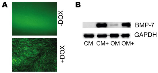 105 cells were seeded to Petri dishes and cultured for 6 days in CM or OM in the presence or absence of 100 ng/mL doxycycline. After 6 days, protein transport from the endoplasmic reticulum to the Golgi apparatus was inhibited by the addition of 10 µg/mL Brefeldin A (Tocris Bioscience, Tocris, United Kingdom). 24 h later, the cells were lysed with radioimmunoprecipitation assay (RIPA) buffer. The protein concentration was determined by Pierce BCA Protein Assay (Thermo Fisher Scientific, Waltham, MA, USA), then 10 µg lysates from each sample were resolved by 14% SDS-PAGE analyzed by western blot using BMP-7 (6E5D12) antibody (Santa Cruz Biotechnology, Dallas, TX, USA) and Anti-GAPDH Antibody (Lifespan Biosciences, Seattle, WA, USA) respectively.